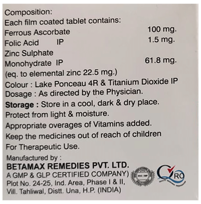 Ferrous ascorbate belongs to the class of haematinics that helps in the management of iron deficiency anaemia|Folic acid is an essential nutrient necessary for the formation of healthy red blood cells and is able to prevent neural tube defects in children during pregnancy and promotes cell growth|Zinc sulphate improves the metabolism and red blood cells in the body