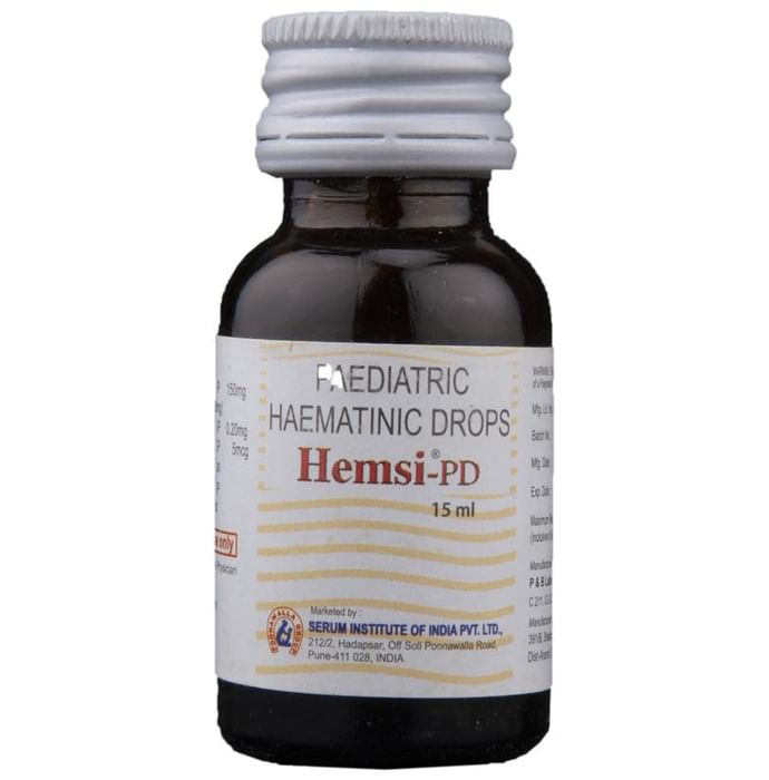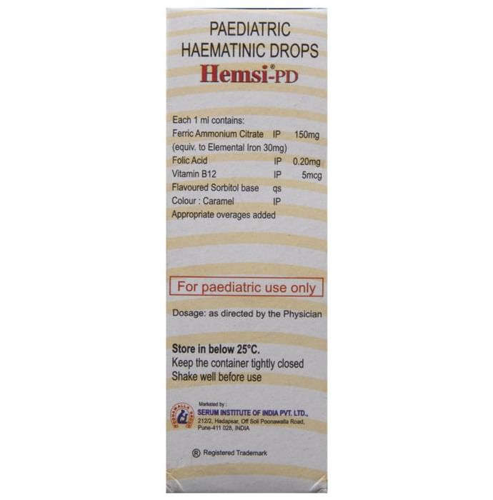 Hemsi PD Drops contains Iron Folic acid Methylcobalamin and Pyridoxine which is a complete therapy for anaemia.Iron transports oxygen throughout the body and maintains red blood cells thus making an individual feel energetic and preventing anemia.Folic acid is essential to numerous bodily functions ranging from nucleotide biosynthesis to the remethylation of homocysteine. It is especially important during periods of rapid cell division and growth. Both children and adults require folic acid to produce healthy red blood cells and prevent anemia. Methylcobalamin and Pyridoxine promotes the initiation and maturation of blood cells. Hemsi PD Drops is used for the treatment ofIron deficiency anemiaIron deficiency due to chronic blood loss or low intake of ironIron deficiency anaemia and nutritional anaemia that occurs especially during pregnancy and lactation. Hemsi PD Drops can be taken orally with water after meals. Use under medical supervision.