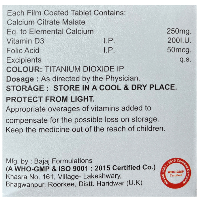 Calcium citrate malate and vitamin D3 both play important roles in maintaining strong bones and preventing osteoporosis|It may help to lower blood pressure and reduce the risk of health ailments|Calcium and vitamin D play a crucial role in the functioning of the nervous system|Vitamin D has been shown to have immune-boosting effects and promotes wellness|Folic acid is important in red blood cell formation and for healthy cell growth and function