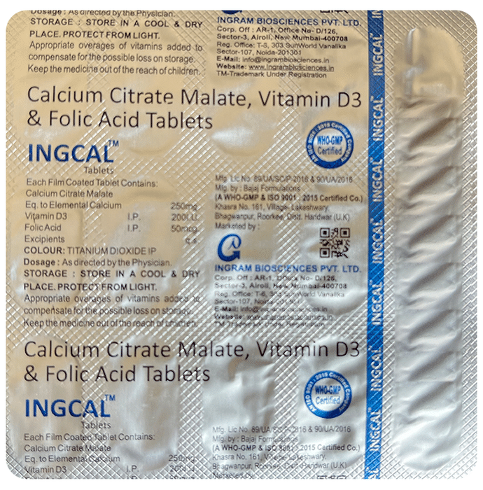 Ingcal Tablet is a nutritional supplement containing Calcium Citrate Malate Vitamin D3 And Folic Acid which are essential nutrients that the body needs for healthy bones and overall wellness. It promotes overall health and wellness.