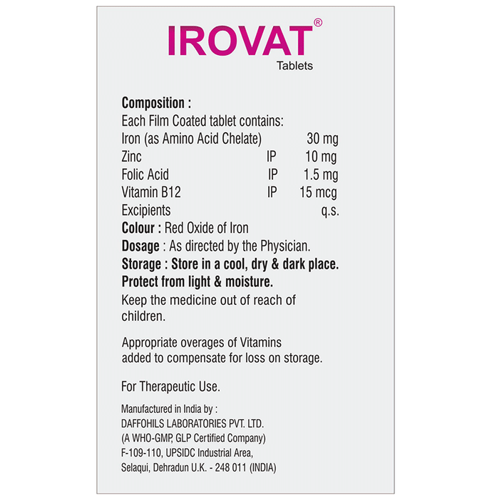 Irovat Tablet is a nutritional supplement formulated with a combination of essential nutrients including iron (as amino acid chelate) zinc folic acid and vitamin B12. These nutrients support overall health and well-being by reducing the risk of deficiency or needing additional support for red blood cell production and immune function.
