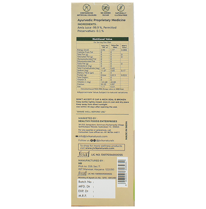 Jivika Naturals Amla Juice constitutes 100% natural compressed amla which has multiple benefits for your body. It helps increase immunity to fight against viruses and controls cough and cold. It helps in keeping healthy blood pressure and also maintains overall body functions. Amla also promotes healthy skin and prevents acne and blemishes. It is also useful in maintaining an ideal weight.