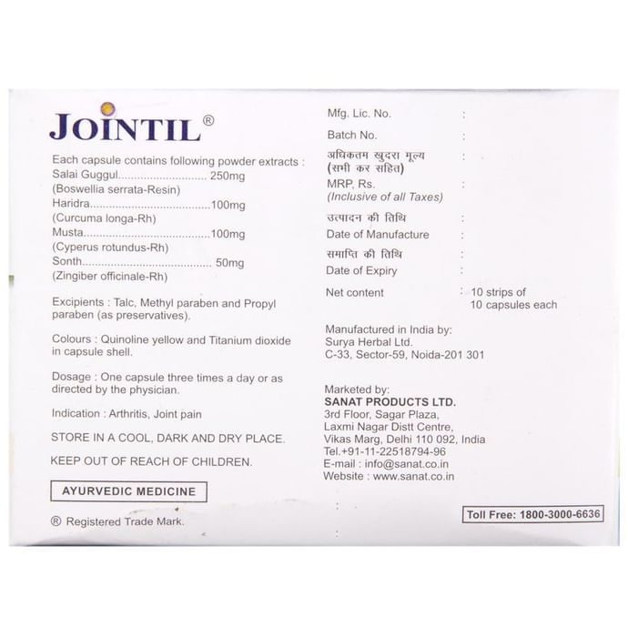 Jointil Capsule is an effective & natural solution for arthritis & joint pain. Jointil capsules contain time tested herbs like Boswellia serrata Curcuma Longa Zingiber Officinale and Cyperus rotundus. Jointil capsules do not cause side effects unlike NSAIDs (pain killers) available in the market. More efficacious when use with Jointil oil. Boswellia serrataThe gum-resin of plant Boswellia serrata (also known as Salai guggul) is used in the Ayurvedic system of medicine for the treatment of arthritis.Boswellic acid in Boswellia offers anti-inflammatory & anti-arthritic activity mediated through the inhibition of pro-inflammatory mediators like leukotrienes cytokines TNF etc.Curcuma LongaExtensive investigation over the last five decades has indicated that the active principle called Curcumin isolated from the rhizome of the plant Curcuma longa.Curcumin Down regulates activity and expression of:COX-2 and 5-LOX enzymes- responsible for inflammation process & Cytokines like TNF-alpha Interleukins (IL-1 IL-2 IL-6 IL-8 IL-12) - Pro-inflammatory mediators. Zingiber OfficinaleGinger is a member of the family of plants that includes cardamom & turmeric. Z. officinale is the Dual inhibitor of eicosanoid (chemical substances that demonstrate inflammatory response) biosynthesis. Cyperus rotundusSterols of Cyperus rotundus possess potent anti-inflammatory properties similar to cortisone. Directions of use:Take one capsule twice or thrice in a day or as prescribed by physician. Use under Medical Supervision