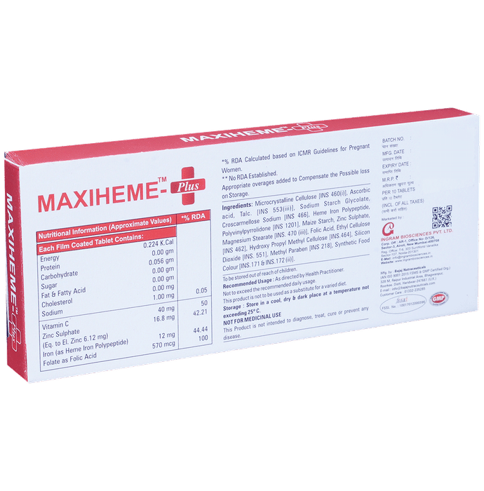 Maxiheme Plus Tablet is useful for restoring iron and red blood cell deficiency. It contains vitamin C which helps boost the immune system and may aid blood pressure management. It also helps to reduce cardiac dysfunction and promotes body development.