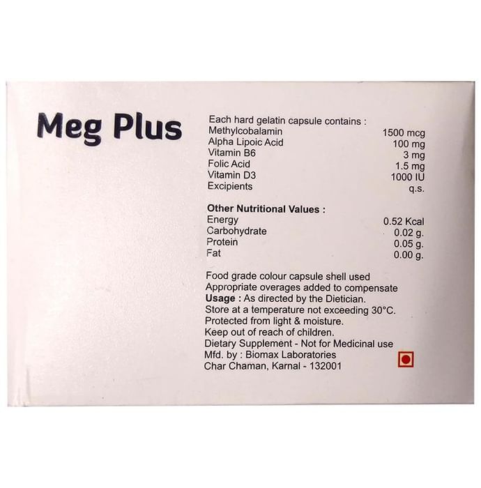Meg Plus Capsule contains alpha-lipoic acid an antioxidant. It is used to break down carbohydrates and to make energy. It helps reduce inflammation and skin ageing and promote healthy nerve function