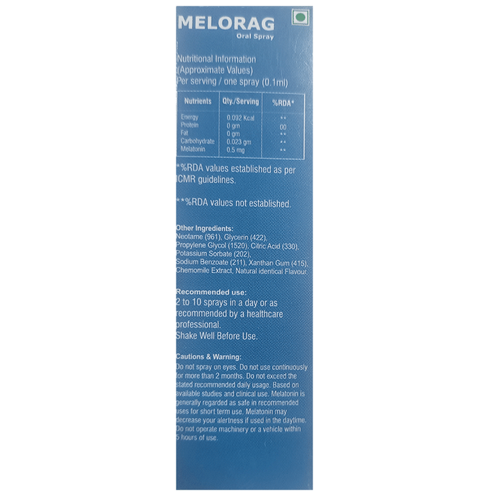 Melorag Oral Spray is a high potency premium quality formula that provides optimal sleep support. It is composed of melatonin and valerian that help to fall asleep faster naturally and wake up refreshed. Melatonin is a hormone produced by the brain in reaction to darkness. It manages the synchronisation of the circadian rhythms as well as sleep.