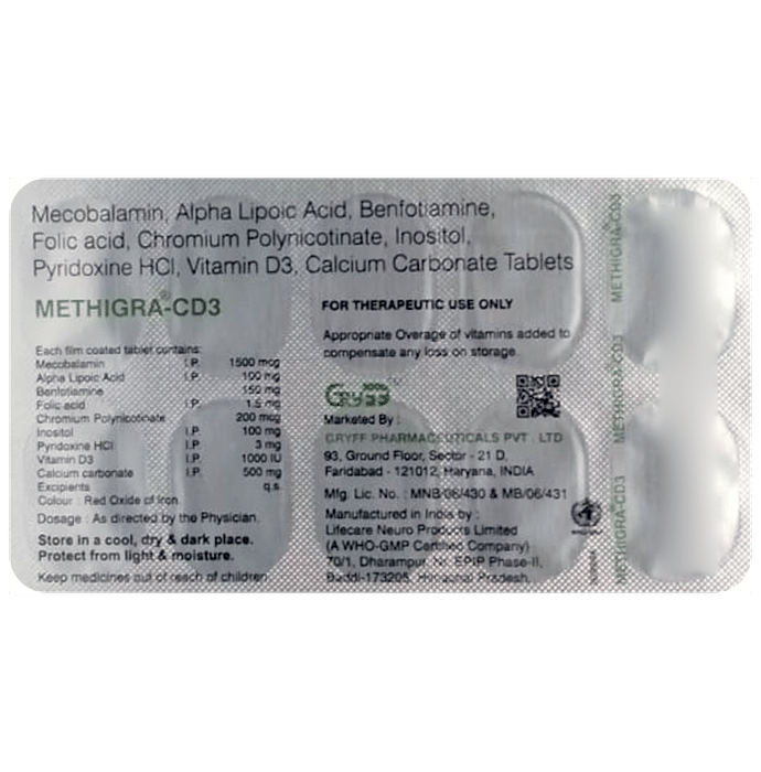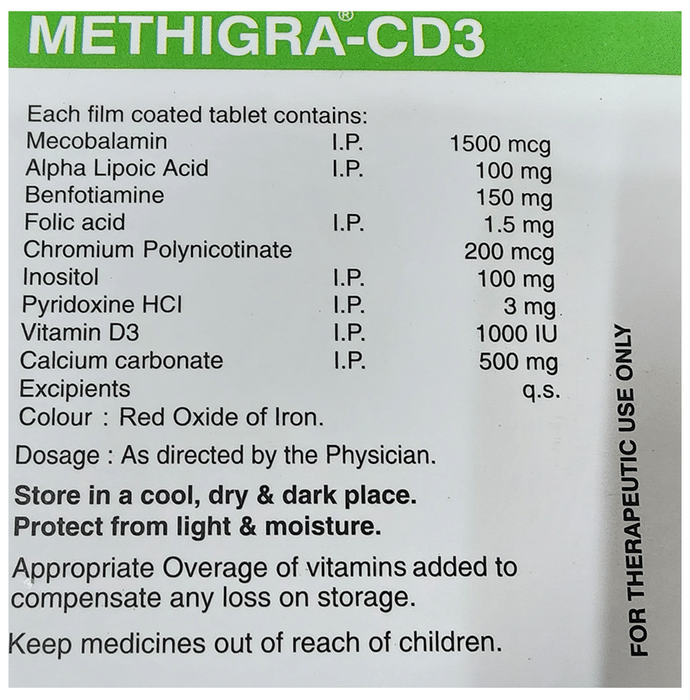 Methigra-CD3 Tablet is a specially formulated medication designed to alleviate the symptoms associated with diabetic neuropathy a common complication of diabetes that affects nerve function in various parts of the body. It is designed to enhance overall health and vitality.