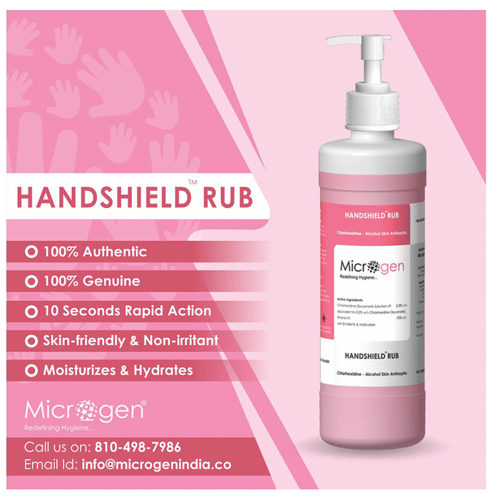 Microgen Handshield Rub is mild to the skin and is effective procedural hand disinfection suitable for use in food processing dairy beverage Industry. HANDSHIELD RUB is effective against most Gram-positive and Gram-negative bacteria and has demonstrated very good activity against viruses.