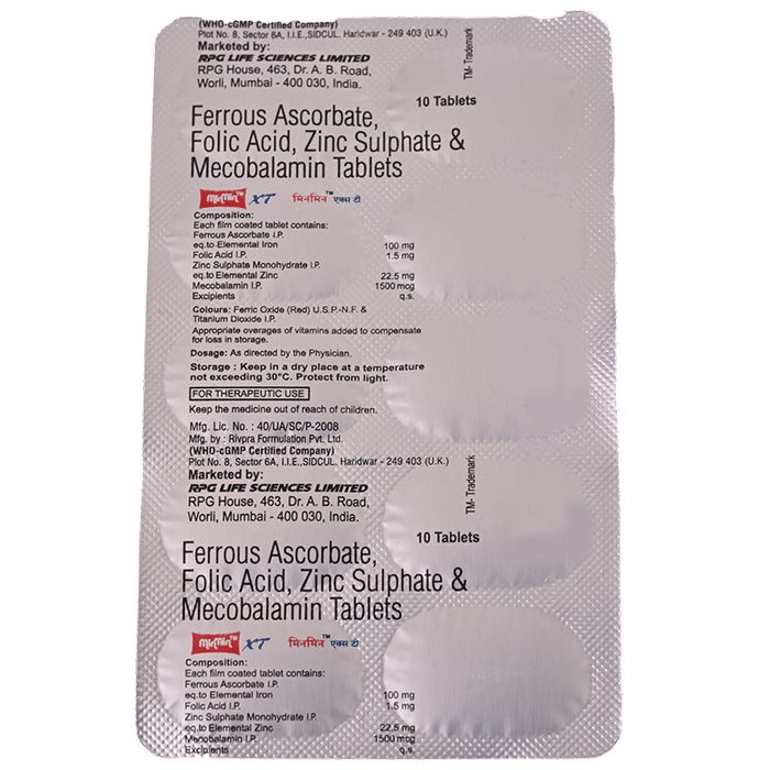 Minmin XT Tablet is a health supplement and adjuvant therapy used to counter vitamin B12 deficiency and support overall health. Minmin XT Tablet is formulated as a nutritional supplement to support overall health and well-being. It contains a combination of key ingredients such as ferrous ascorbate folic acid mecobalamin (vitamin B12) and zinc.The tablet is used for the treatment and prevention of different forms of anaemia as well as for preventing iron folic acid and vitamin B12 deficiencies.
