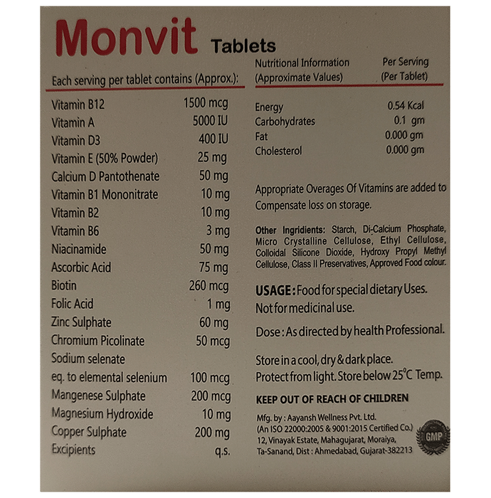 Monvit Tablet it is a dietary supplement formulated with multivitamins multi-minerals and antioxidants that promote your overall health and well-being. The antioxidants protect the body against free radicals and oxidative stress. It helps strengthen the immune system and improve the body's functioning.