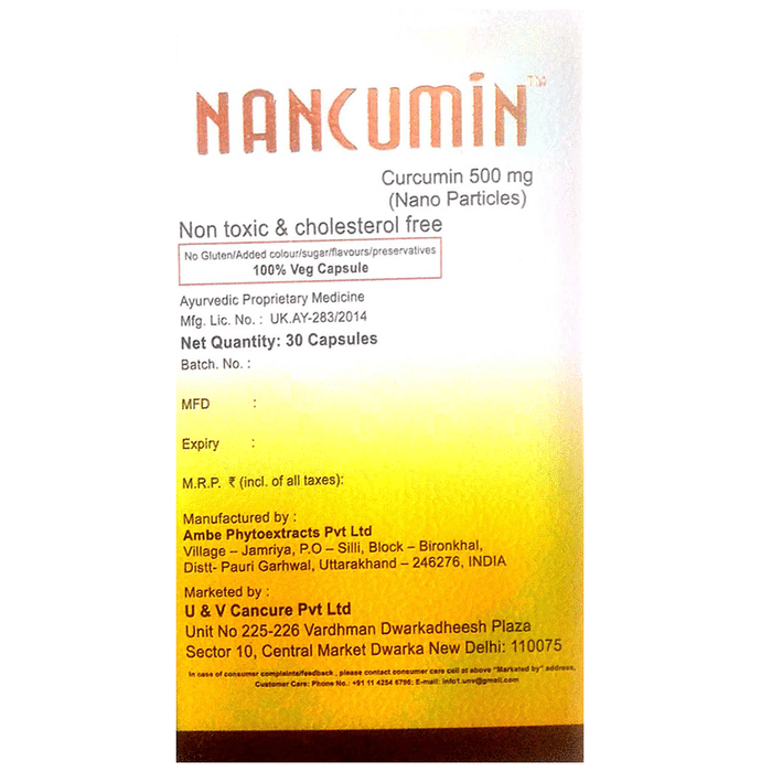 Nancumin 500mg CapsuleIt is a dietary supplement formulated with nano curcumin that helps boost immunity. It is rich in antioxidants that protect against free radicals and help lower cholesterol levels. It has antioxidant and anti-inflammatory properties that can help promote heart and joint health