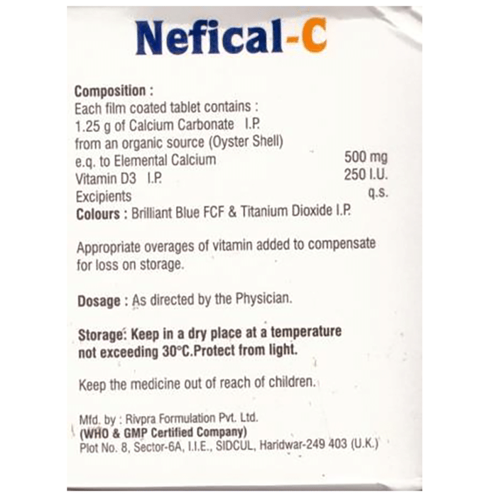 Nefical-C TabletIt is a health supplement formulated with calcium and vitamin D3 for healthy bones joints and the immune system. It can improve bone density tooth enamel and muscle functions.