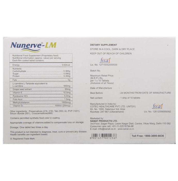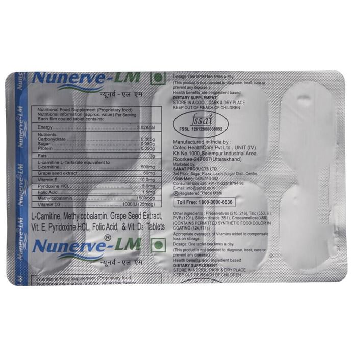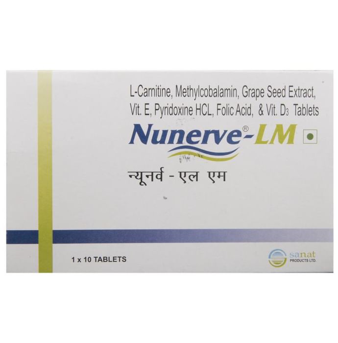 Nunerve LM Tablet is an ideal composition of L-Carnitine fortified with Mecobalamin Folic Acid Grape seed extract Vitamin E Pyridoxine HCL and Vitamin D3. Role of Key ingredients: L-Carnitine is an amino acid (a building block for proteins) naturally produced in the body. It provides support for nervous system cardiovascular system and muscles. Mecobalamin Folic Acid & Pyridoxine lowers total homocysteine level (Hyper- homocysteinemia) in hemodialysis patients. Hyperhomocysteinemia is a possible risk factor for coronary artery disease. Mecobalamin also prevent & treat symptoms of diabetic neuropathy & CVDs. Vitamin E is an antioxidant that occurs naturally in foods such as nuts seeds and leafy green vegetables. Vitamin E is a fat-soluble vitamin important for many processes in the body. Nunerve LM Tablet reduces frequency of muscle/leg cramps more effectively as compared to monotherapy. Protect cell membrane and tissues from oxidative damage and promotes healthy circulatory system. Nunerve LM Tablet is recommended in Neuropathy Diabetes & Cardiovascular diseases. Direction for use: One tablet to be taken 1-2 times a day Use under medical supervision