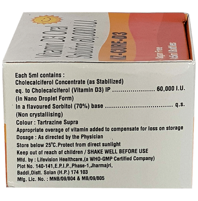 NZ-Cure-D3 Oral Solution Sugar-Free is a sugar-free vitamin D3 oral solution containing 60000 IU meticulously formulated for the prevention of vitamin D and calcium deficiency. This solution serves as an adjuvant in the management of osteoporosis and other bone disorders. Especially beneficial as a supplement in situations where the body's vitamin D requirements are elevated such as in the elderly and growing children.