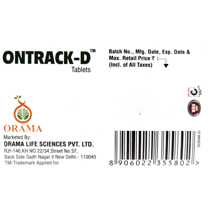 Ontrack-D Tablet It is a dietary supplement formulated with calcium citrate malate vitamin D3 zinc and magnesium that promote bone and joint health. It helps in muscle contraction muscle building and flexibility of joints. Vitamin D3 may help improve bone health and lower osteoporosis risk