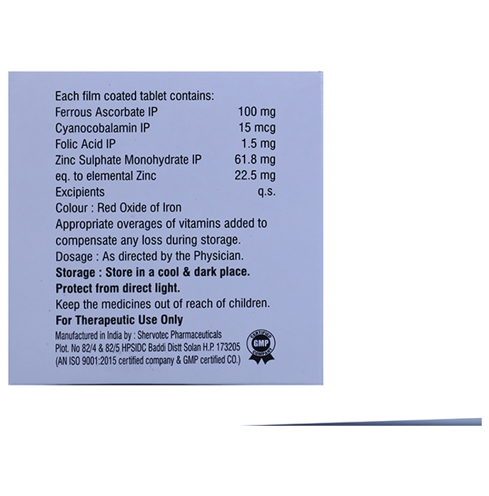 Ferrous ascorbate (Iron) is required for red blood cell production and haemoglobin formation|Cyanocobalamin (Vitamin B12) can help support brain health and boost nerve myelination. It is an essential nutrient that helps the body make healthy red blood cells and nerve cells|Folic Acid helps in the development of healthy red blood cells and supports nervous and heart health|Zinc helps boost immunity and promote the growth of body tissues