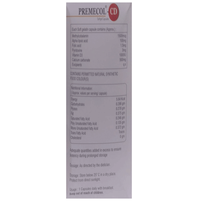 Premecol-CD Softgel Capsule is a potent formula that contains the benefits of methylcobalamin alpha lipoic acid pyridoxine HCL calcium carbonate folic acid and vitamin D3. This potent formula helps support the wellness of the bones and the joints. This formula contains vitamin D3 which helps fight against bone degeneration. It is helpful in promoting the wellness of the nervous system as well. This formula improves the production of red blood cells and may fight against anaemia.