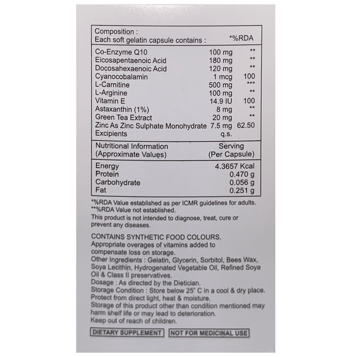 Coenzyme Q10 helps to promote cellular energy production in the body|Coenzyme Q10 promotes heart health by reducing inflammation cholesterol levels triglyceride levels and lowering high blood pressure|EPA DHA and ginkgo biloba help in promoting proper brain functioning and may help in dealing with problems related to cognitive decline|Green tea extracts are rich in antioxidants which protects the body from the oxidative damage of the free radicals|Zinc sulphate helps to improve the immune system of the body and protects from various illnesses and infections