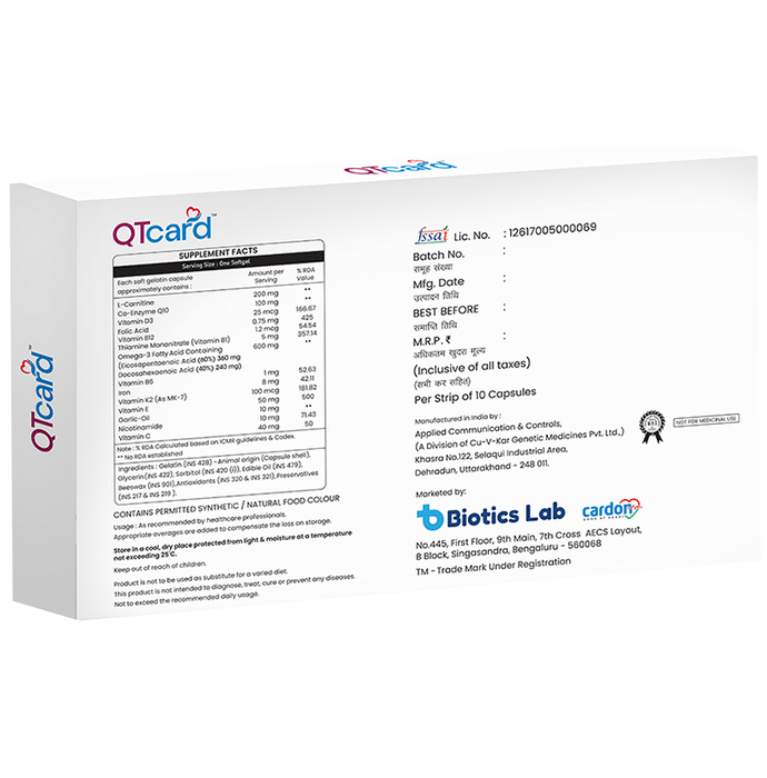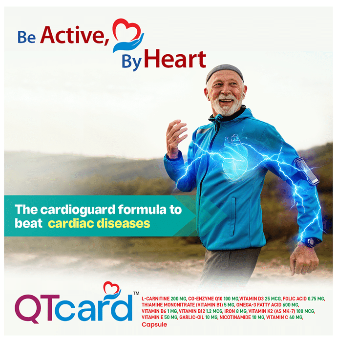 Qtcard Soft Gelatin Capsule Qtcard is a 14 vital cardiac nutrient adjuvant therapy for cardiac diseases and post-cardiac surgery patients. Qtcard is a first-of-its-kind combination in India that focuses on the therapeutic strength of the ingredients. Qtcard offers omega-3 fatty acids in a higher strength for heart health. Also vitamin K2-7 vitamin D3 and garlic oil help reduce stiffness in the arteries calcification of the valves and arteries and the risk of heart disease. The vitamins B6 B9 (folic acid) and B12 help control hyperhomocysteinemia and lower the risk of atherosclerosis. Coq10 and L-carnitine work together to give you more energy and protect your body from damage. The anti-oxidative properties of vitamin C and vitamin E protect against oxidative stress-induced cellular damage by removing toxins/free radicals in the heart. Thus Qtcard offers a complete cardiac supplement formula.