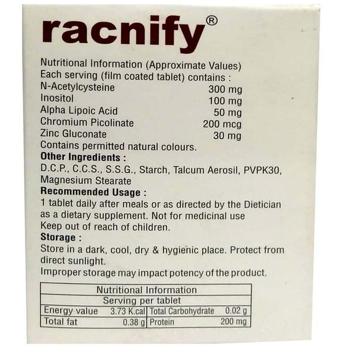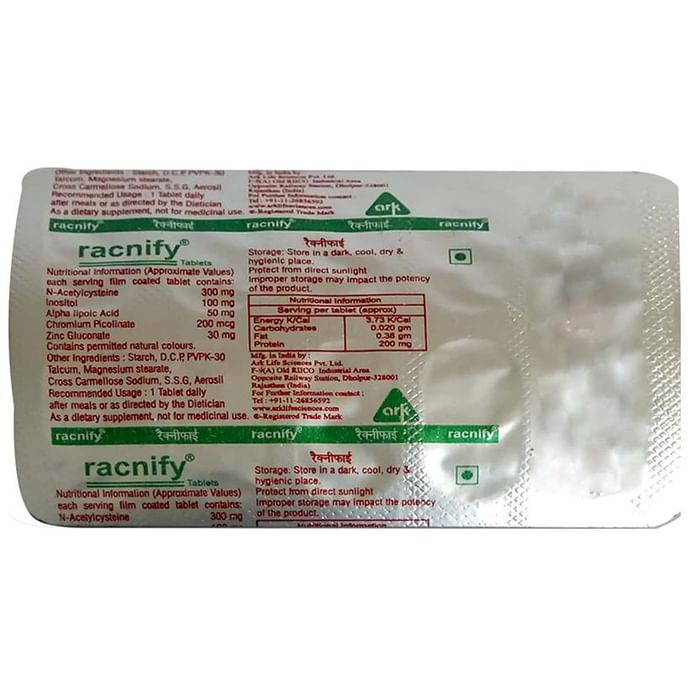 Racnify Tablet is an upgraded formula supplement enriched with alpha lipoic acid and zinc which supports bones joints and muscles. It supports the body against oxidative stress. It boosts immunity and promotes overall health and well-being of the body