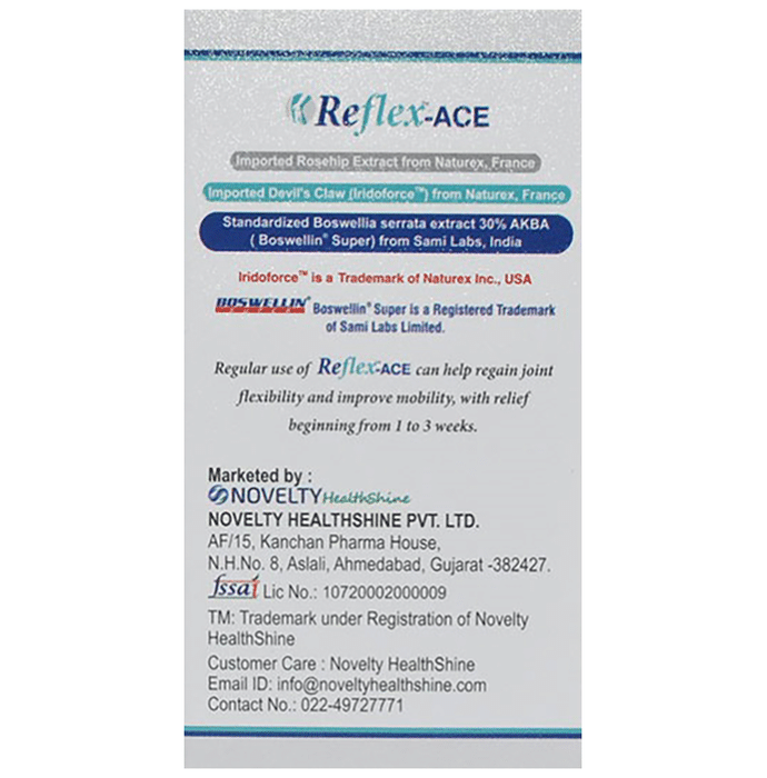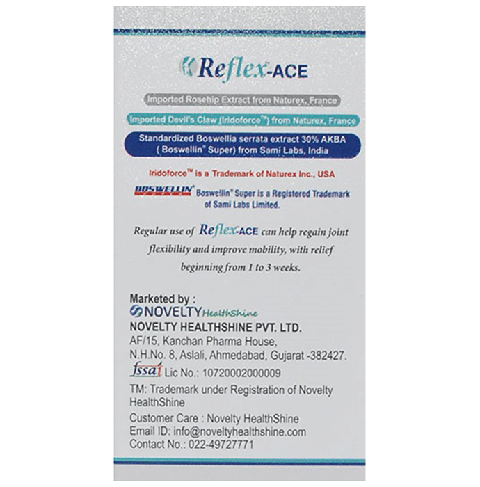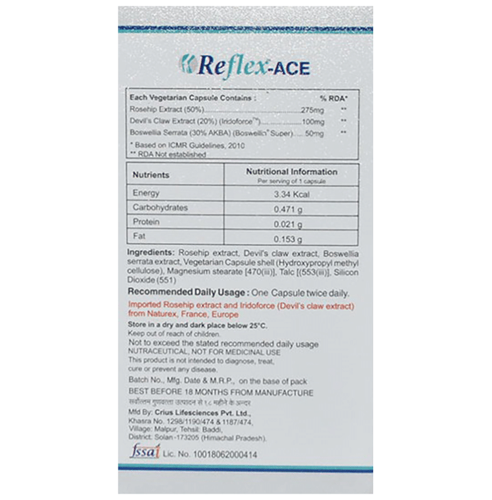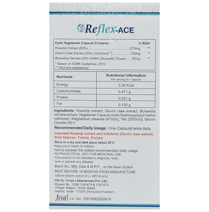 Reflex-Ace Capsule is a dietary supplement used to help regain flexibility and improve mobility. It helps ease the pain in your joints and muscles. It also gives relief from cramps and pains related to the same. It provides comfort from the minor symptoms of rheumatism.