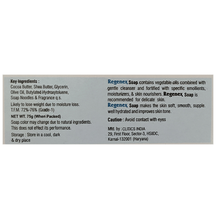 Regenex Soap is a formulation that contains vegetable oils combined with a gentle cleanser fortified with specific emollients moisturisers and skin nourishers. It is suitable for delicate and sensitive skin