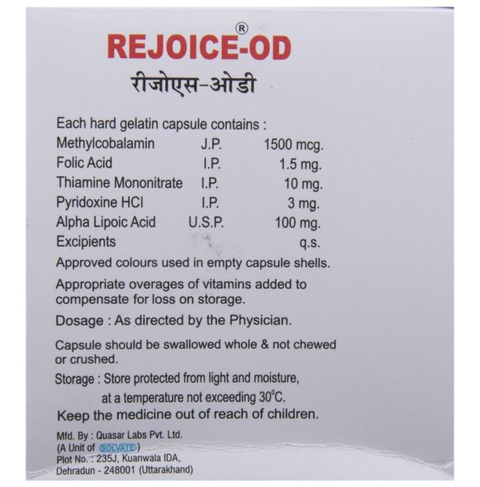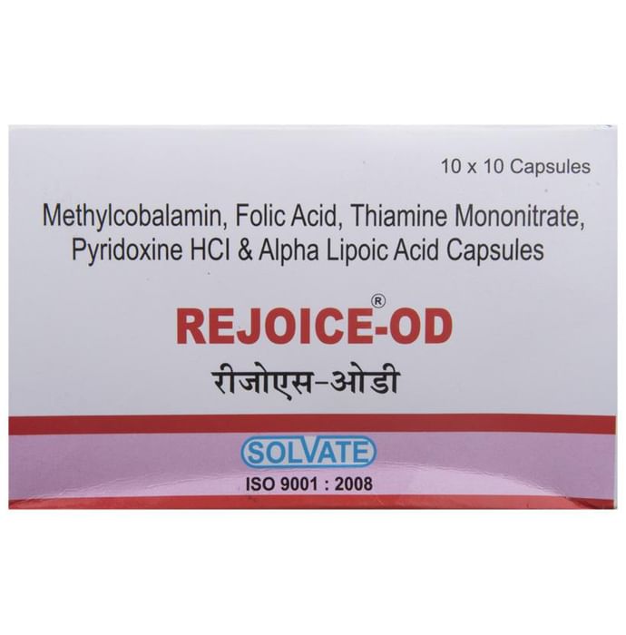 Rejoice-OD Capsule is a nutritional supplement that contains several active ingredients including mecobalamin alpha-lipoic acid pyridoxine folic acid and thiamine. It is primarily used for the management of megaloblastic anaemia diabetic neuropathy and cardiovascular diseases. The alpha-lipoic acid present in Rejoice-OD capsule can help manage diabetic neuropathy which is a common complication of diabetes. Pyridoxine folic acid and thiamine are also essential B vitamins that can help support overall health.