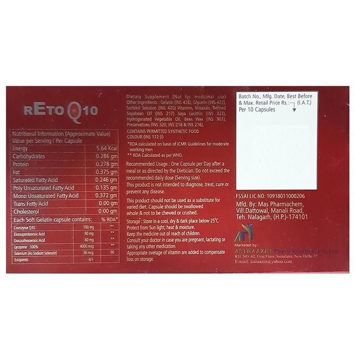 Reto-Q10 Soft Gelatin Capsules is a dietary supplement fortified with benefit of Co-enzyme Q10. Coenzyme Q10 levels decrease with age. This product thus helps to maintain the level of Co-enzyme Q10 in body.