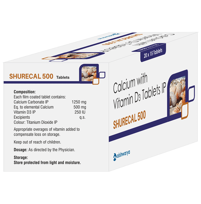 Shurecal 500 Tablet is a dietary supplement containing calcium carbonate and vitamin D3. It is formulated to support bone health and calcium metabolism in the body.