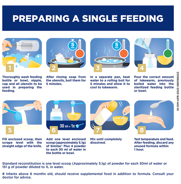 Standard reconstitution is one level scoop (approximately 5.1 g) of powder for each 30 ml of water or 151 g of powder diluted to 1 Litre in water. Consult your baby’s doctor about how much your baby should be consuming.