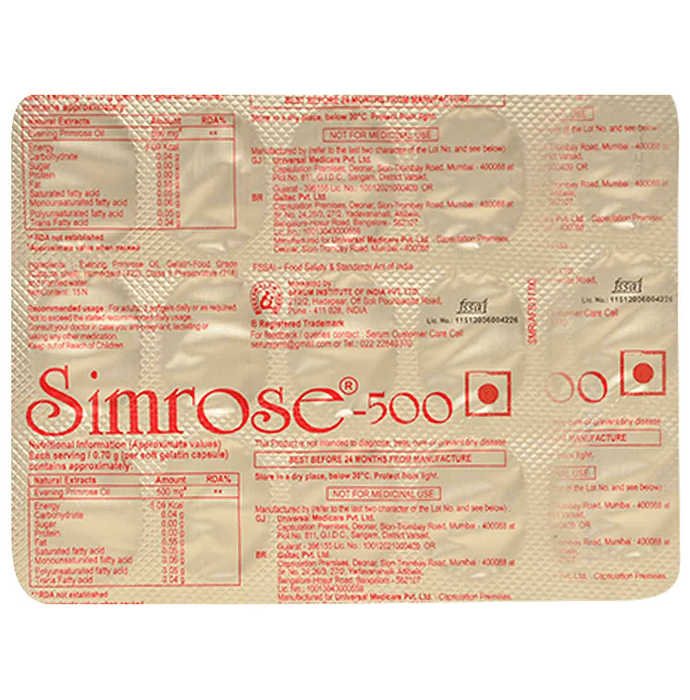 Simrose Capsule is a dietary supplement for women health which contains Evening Primrose oil (EPO) 500mg. Evening Primrose oil is a rich source of omega 6 essential fatty acids and gamma-linoleic acid which is converted in the body to form prostaglandins a hormone-like substance. Evening Primrose oil Capsule are also beneficial in lowering blood cholesterol reducing blood pressure decreasing anxiety and maintaining healthy skin and hair. Use under medical supervision