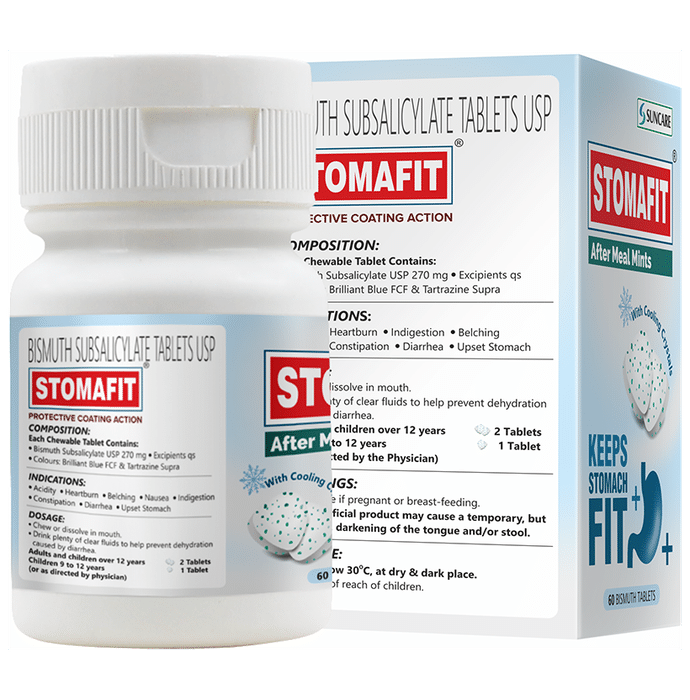 Stomafit’s main ingredient is Bismuth and it acts by coating the digestive system|This process cuts the nutrition supply for the bacteria and promotes the local release of endogenous prostaglandins which aid in the recovery of the epithelial cells and the mucosal lining|Along with preventing indigestion and acidity stomafit mints keep your breath minty fresh