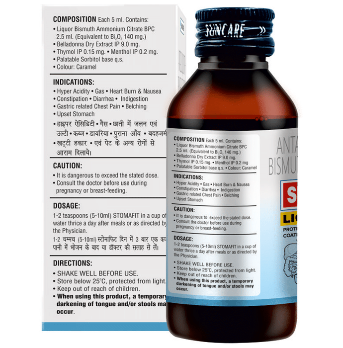 Stomafit antacid liquid swiftly alleviates symptoms of acidity and indigestion|The combination of belladonna extract thymol and menthol works synergistically to soothe inflammation and calm the digestive tract|Liq. bismuth ammonium citrate effectively neutralises excess stomach acid reduces acidity and prevents further irritation|By promoting smooth digestion this antacid liquid helps alleviate bloating and discomfort associated with gas accumulation|Unlike some antacids that may cause irritation Stomafit is gentle on the stomach lining making it suitable for long-term use