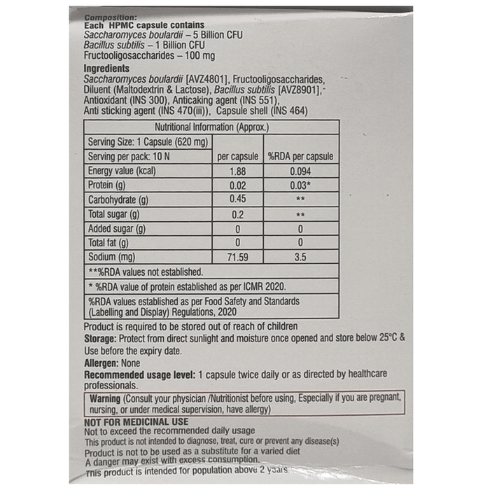 Subtilis Capsule is a comprehensive dietary supplement designed to promote gastrointestinal health and overall digestive well-being. The capsule's formulation includes saccharomyces boulardii a beneficial yeast known for its positive impact on gut flora and bacillus subtilis a probiotic bacterium associated with supporting gut health. Additionally the inclusion of fructo oligosaccharides (FOS) provides a prebiotic element that nourishes beneficial gut bacteria. Together these ingredients synergistically work to maintain a balanced microbiome fostering optimal gut function and digestive harmony. Subtilis Capsule offers a holistic approach to digestive support encompassing probiotic and prebiotic elements for a well-rounded gastrointestinal supplement.