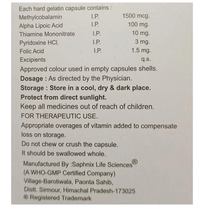 Methylcobalamin is a form of vitamin B12 that helps in managing certain types of anaemias and nerve problems. It plays a crucial role in the formation of red blood cells and the maintenance of the nervous system|Alpha lipoic acid acts as a potent antioxidant protecting against cell damage. It may help improve the functioning of neurons in diabetic patients and is used to manage burning pain and numbness in the legs and arms|Thiamine mononitrate also known as vitamin B1 is essential for the proper functioning of the nervous system and the metabolism of carbohydrates. It helps convert food into energy and supports the normal functioning of the heart muscles and nervous system|Pyridoxine HCI also known as vitamin B6 is involved in various bodily functions including the metabolism of proteins carbohydrates and fats. It plays a role in the production of neurotransmitters and helps maintain normal brain development and function|Folic acid a synthetic form of folate (vitamin B9) is essential for the production of red blood cells and DNA synthesis. It is particularly important during pregnancy to support the healthy development of the fetus