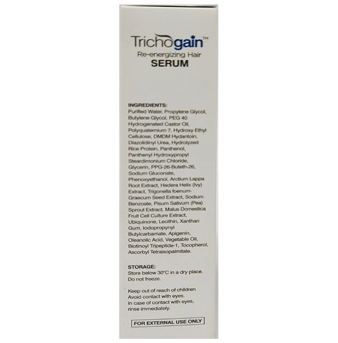 Trichogain Re-Energizing Hair Serum is a re-energising hair serum that helps stimulate the scalp improve circulation and promote hair growth. It helps enhance the tensile strength of hair.