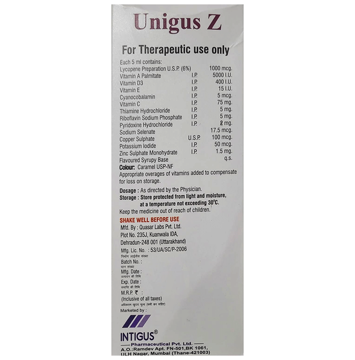 Unigus Z Syrup is a dietary supplement enriched with essential vitamins and minerals vital for maintaining overall health and well-being. Each serving of this syrup contains a potent blend of lycopene preparation U.S.P. vitamin A palmitate vitamin D3 vitamin E cyanocobalamin (Vitamin B12) vitamin C Thiamine hydrochloride (Vitamin B1) riboflavin sodium phosphate (Vitamin B2) pyridoxine hydrochloride (Vitamin B6) sodium selenate copper sulphate potassium iodide and zinc sulphate monohydrate. This combination of nutrients supports various bodily functions ensuring optimal functioning and vitality.