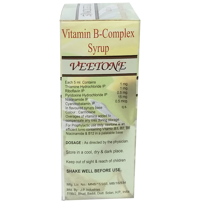 Veetone Syrup is a vitamin supplement. It contains a combination of folic acid pyridoxine and methylcobalamin. It is used to prevent and manage deficiency of vitamins B6 B9 and B12. It is beneficial for the body's overall growth by providing essential vitamins.