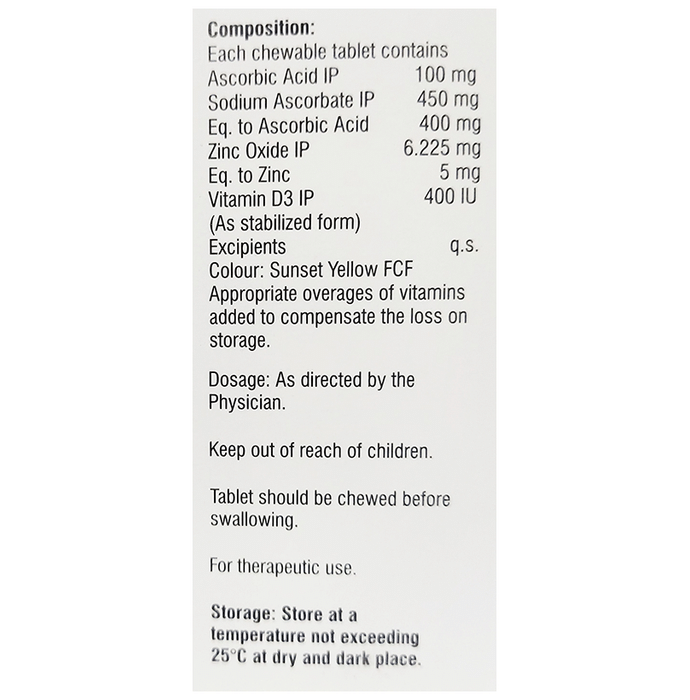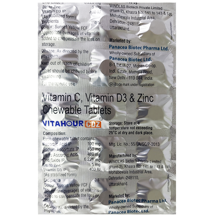 Vitahour CDZ Chewable Tablet is beneficial for strengthening bones and muscles|It contains ascorbic acid also known as vitamin C which helps in the growth and development of the body|It also contains zinc which helps in boosting the immune system and metabolism