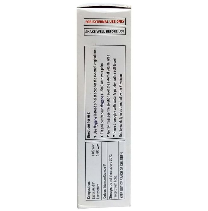 It is for external use only Shake well before use|Use Vygene Solution instead of toilet soap for the external vaginal area|Tilt and gently pour the 5ml of solution on to your palm|Gently massage the solution over the external vaginal area|Rinse the area of application thoroughly with water and pat dry using a soft towel|Use this solution twice daily or as directed by the healthcare professional