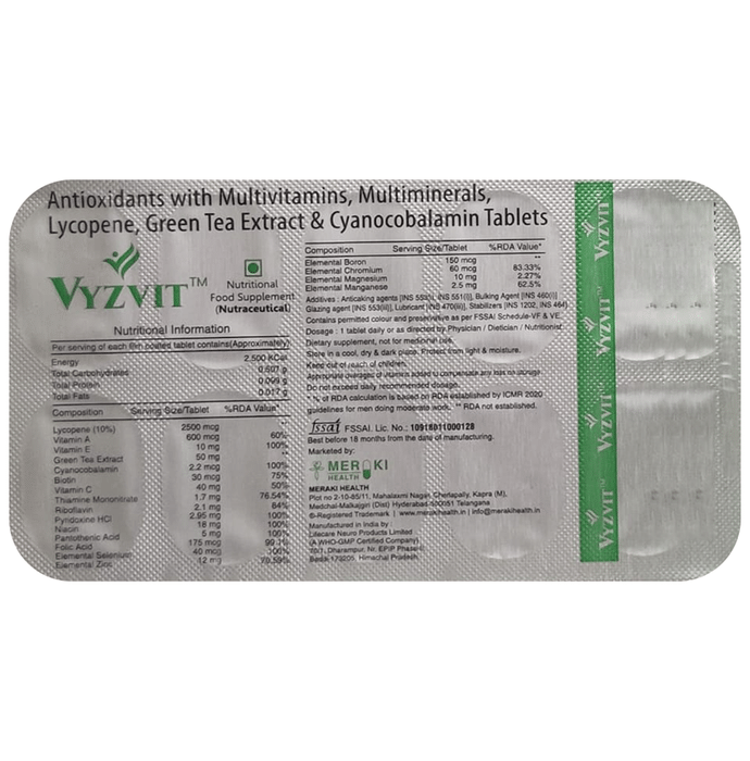 Vyzvit Tablet is a multivitamin and multimineral formula. It helps enhance immune and overall health functions. It is beneficial for reducing oxidative stress and supports cell generation. It is also helpful for the wellness of the skin. It may also help fight anaemia.