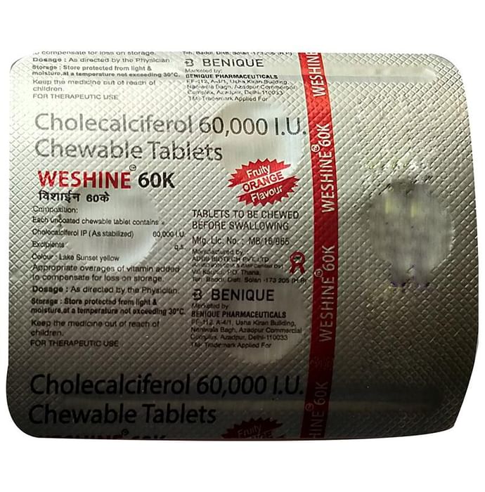 Weshine 60k Chewable Tablet Fruity Orange contains Cholecalciferol 60000 iu (International units). Cholecalciferol (Vitamin D3) is a fat-soluble vitamin that helps the body absorb calcium and phosphorous from food and supplements. It helps keep the bones and teeth strong and healthy and also aids the functioning of cells and muscles
