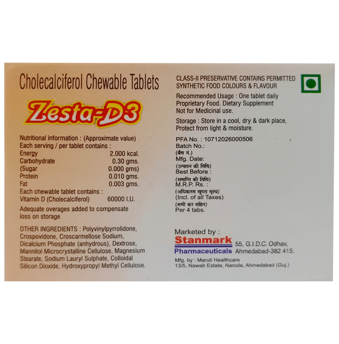 Zesta-D3 Chewable Tablet is a tablet formulation containing vitamin D as the key ingredient. It is primarily used to manage vitamin D deficiencies which in turn enables the body to easily absorb calcium. Key ingredients:Vitamin D3 (cholecalciferol)Key Benefits:Vitamin D belongs to the class of fat-soluble vitamins which are necessary for calcium and phosphorus absorption by the body which in turn helps in proper bone developmentIt plays a vital role in cell metabolism and enables the proper functioning of neurons in the bodyIt helps in preventing osteoporosis and strengthens the muscles and joints of the bodyIt helps in the easy healing of fractures and also prevents chances for recurrent fracturesDirections For Use:Take Zesta-D3 Chewable Tablet as directed by the physicianSafety information:Read the label carefully before useStore in a cool and dry place away from sunlightKeep out of reach of childrenUse under medical supervisionDon’t exceed the recommended dosage