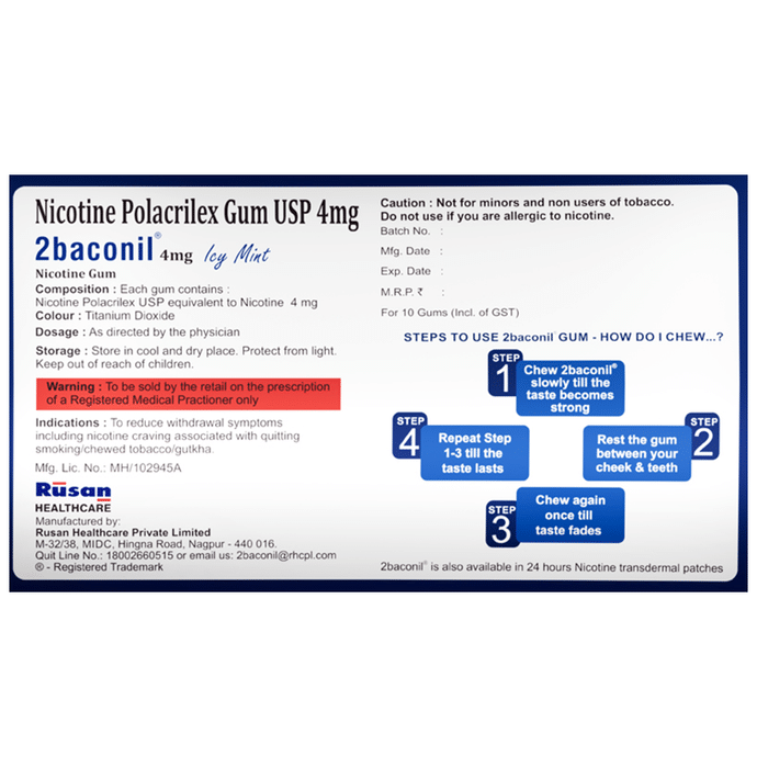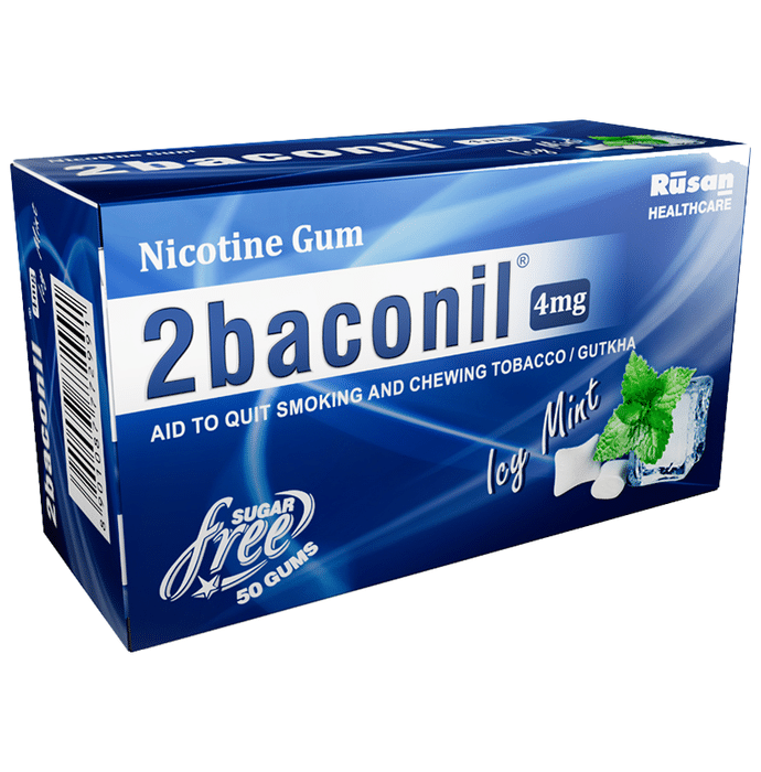 2baconil 4mg Nicotine Gums for Quit Smoking / Tobacco (For More Than 20 Cigarette/Day Smoker) Mint is a medicine used to quit smoking by reducing the craving for a cigarette and the irritable feeling that occurs when you stop smoking. It works by mimicking the effect of nicotine by binding to the nicotine receptors in the brain.2baconil 4mg Nicotine Gums for Quit Smoking / Tobacco (For More Than 20 Cigarette/Day Smoker) Mint can be used to help you stop smoking completely or cut down the amount you smoke. Stopping smoking is hard and you need to be ready and committed. But quitting is one of the most important things you can do to improve your health and live longer. This medicine should be taken as advised by doctor as it can be habit forming. In case you have missed any dose take it as soon as you remember it. Do not skip any doses and finish the full course of treatment. However before taking this medicine it is better to inform doctor if you are suffering from any heart liver or kidney disease. You must not smoke while using this medicine as it can result in dangerous effects.Many people use more than one type of nicotine replacement therapy (NRT) to improve their chances such as nose or mouth sprays which also contain nicotine. You are more likely to be successful if you also have counselling join a support group and make some behaviour changes such as avoiding situations you associate with smoking.Some of the common side effects include nausea vomiting sore throat and mouth. It may also cause dizziness and sleepiness so do not drive or do anything that requires mental focus until you feel better. It may cause headaches so it is better to take plenty of fluids whole day but inform your doctor if it does not go away. These effects are often mild and will wear off with time. If you are pregnant or breastfeeding you must consult doctor before taking this medicine.