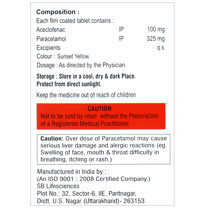 Salt Composition Aceclofenac (100mg) + Paracetamol (325mg)