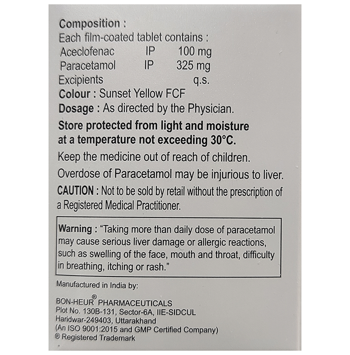 Salt Composition Aceclofenac (100mg) + Paracetamol (325mg)