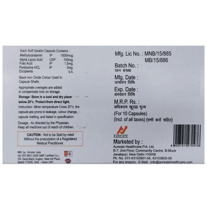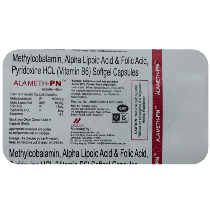 Salt Composition Methylcobalamin (1500mcg) + Alpha Lipoic Acid (100mg) + Vitamin B6 (Pyridoxine) (3mg) + Folic Acid (1.5mg)