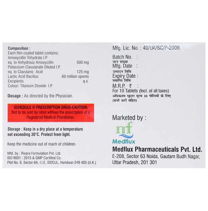 Salt Composition Amoxycillin (500mg) + Clavulanic Acid (125mg) + Lactobacillus (60Million spores)