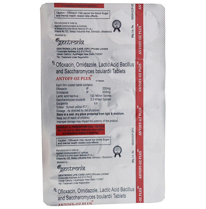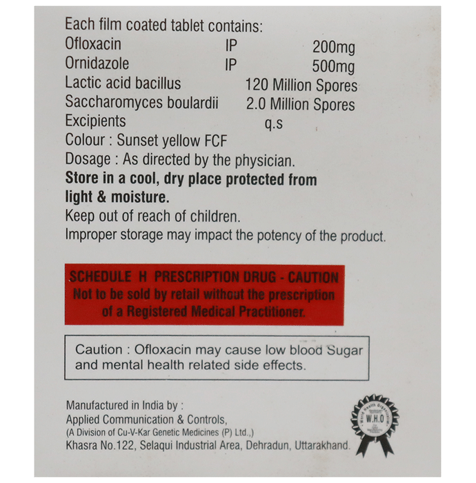 Salt Composition Lactobacillus (120Million spores) + Ofloxacin (200mg) + Ornidazole (500mg) + Saccharomyces boulardii (2Million spores)