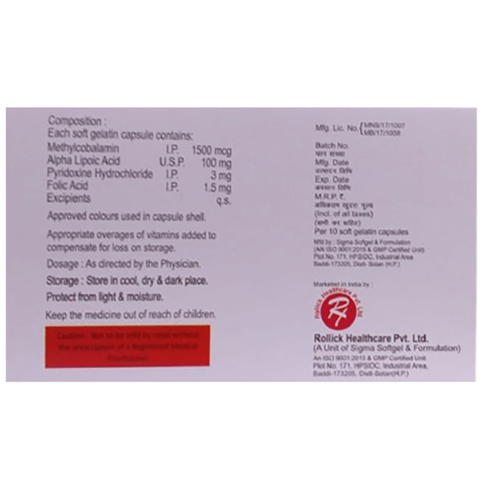 Salt Composition Methylcobalamin (1500mcg) + Alpha Lipoic Acid (100mg) + Vitamin B6 (Pyridoxine) (3mg) + Folic Acid (1.5mg)